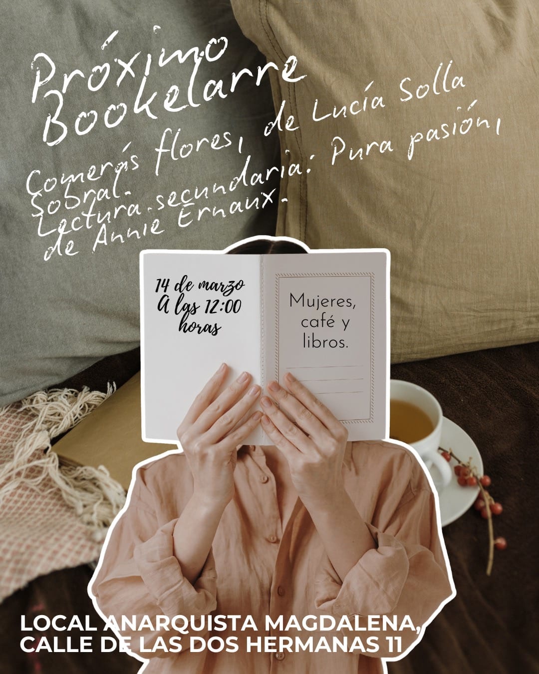 El sábado 14 de marzo llega una nueva sesión de Bookelarre. El club de lectura de y para mujeres se reunen para comentar "Comerás flores" y compartir café. Como lectura secundaria os proponen "Pura pasión", de Annie Ernaux.