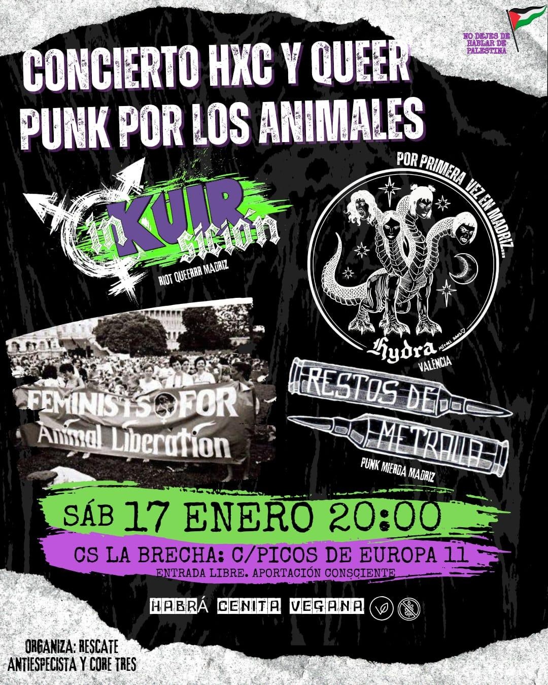 El sábado 17 de enero reventamos Vallekas con una noche de HXC y Queer Punk por los animales no humanos. Los beneficios irán destinados a pagar gastos veterinarios de les rescatades.