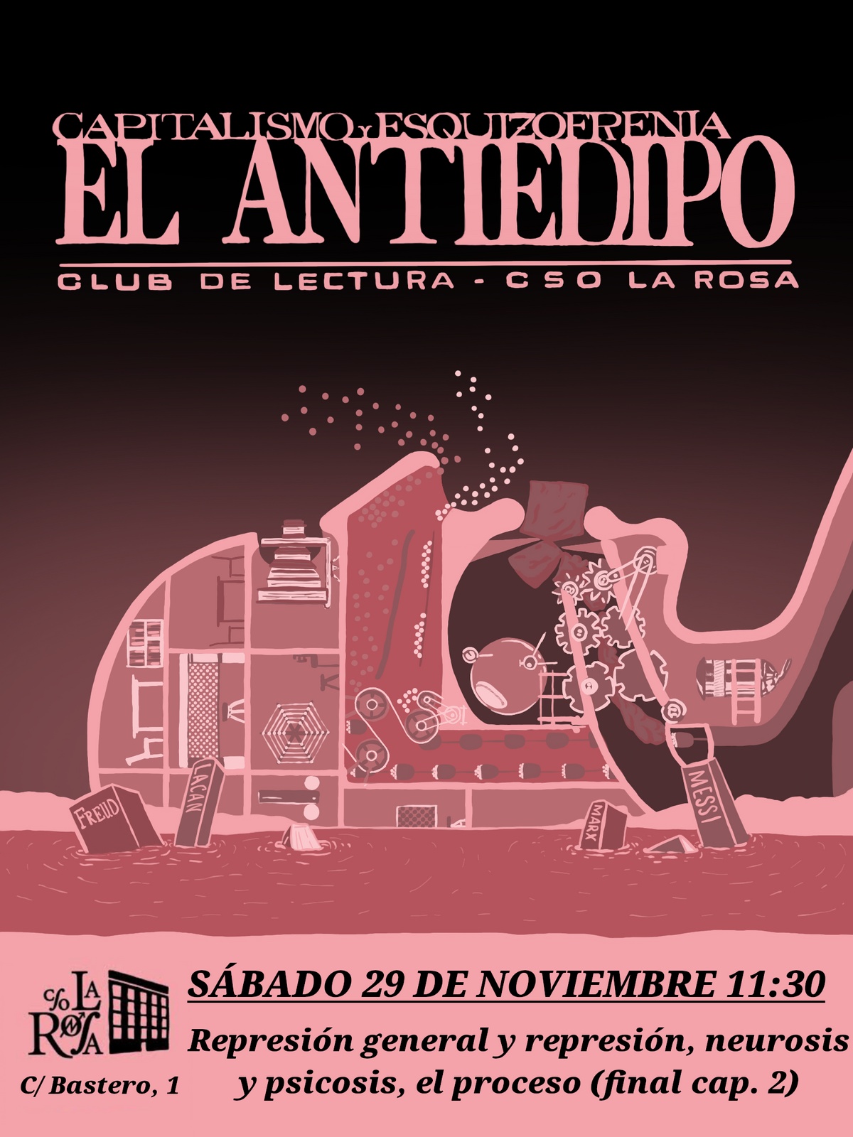 Grupo de lectura de El Antiedipo de Gilles Deleuze y Félix Guattari. En la quinta sesión trabajaremos los tres últimos epígrafes del capítulo 2: represión general y represión, neurosis y psicosis, el proceso (hasta la página 142 en la edición de Paidós).