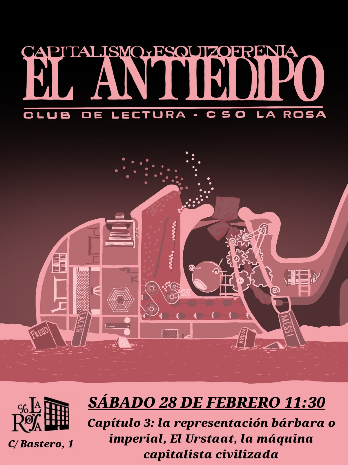Grupo de lectura de El Antiedipo de Gilles Deleuze y Félix Guattari. En la novena sesión trabajaremos los tres siguientes epígrafes del capítulo 3: la representación bárbara o imperial, El Urstaat, la máquina capitalista civilizada (hasta la página 247 en la edición de Paidós).