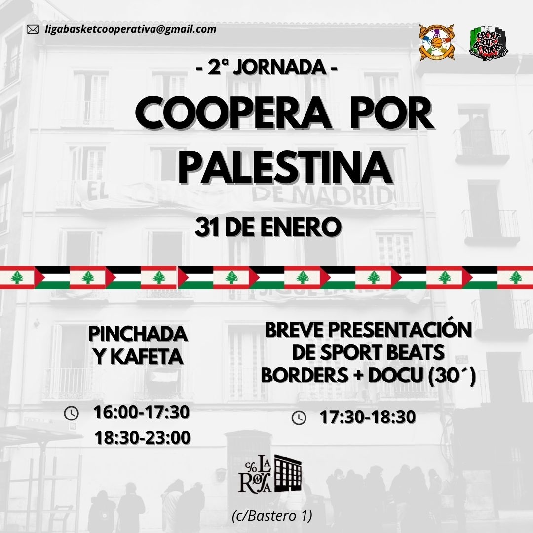 El 31 de enero, sábado, nos vemos en @cso_larosa🌹(La Latina) en este eventazo organizado desde la Comisión x Palestina de la @ligabasketcooperativa y @sportbeatsborders_