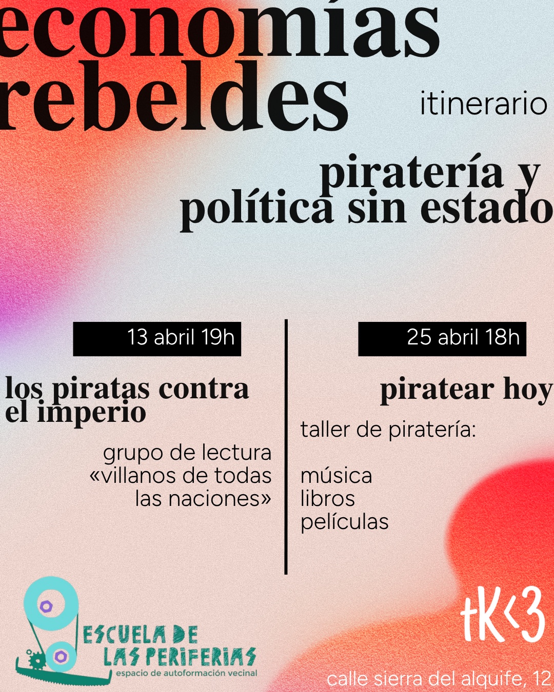 este ciclo parte de la idea que la piratería no es una figura romántica o marginal, es un campo de conflicto político donde se han puesto en juego formas de vida, de organización y de apropiación que desbordan el orden dominante. lejos de la caricatura del saqueador individualista, los piratas han sido también laboratorio: espacios donde se ensayaron repartos más igualitarios del botín, formas de autogobierno, alianzas improbables y, sobre todo, una relación conflictiva con la propiedad y la ley.
