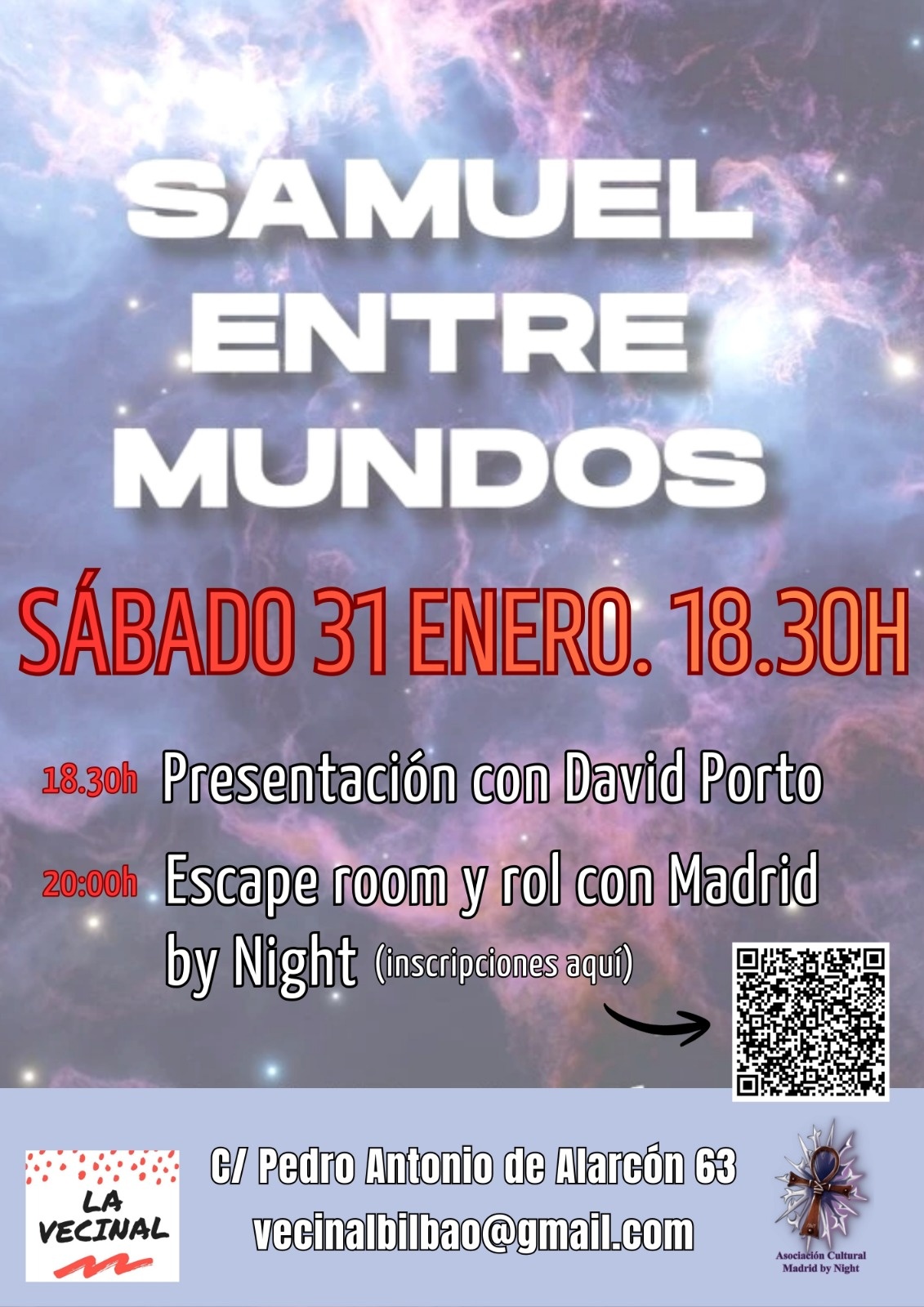 A las 20h el colectivo de rol en vivo Madrid by night organiza una actividad que mezcla rol y escape room. ¡Hay dos sesiones, a las 20 y 21h, y se necesita inscripción previa gratuita en el QR del cartel!