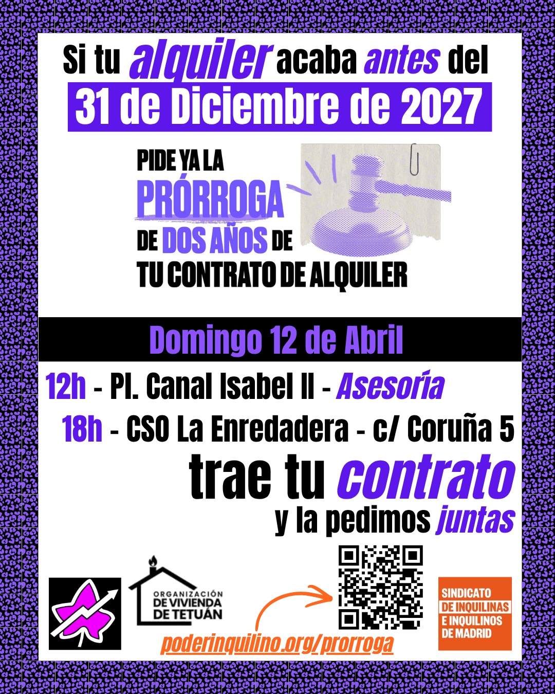 ➡️ A las 12:00 con el Sindicato de Inquilinas en la Plaza de las Palomas. Asesoría sobre la prórroga.