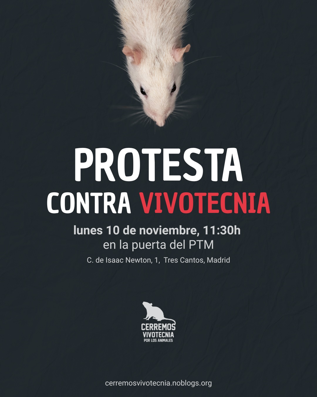 Convocamos protesta contra Vivotecnia el próximo lunes 10 de noviembre de 2025, festivo en Madrid pero laborable en Tres Cantos. Una oportunidad para manifestarnos ante las puertas del laboratorio en un día donde el personal estará en el interior trabajando.