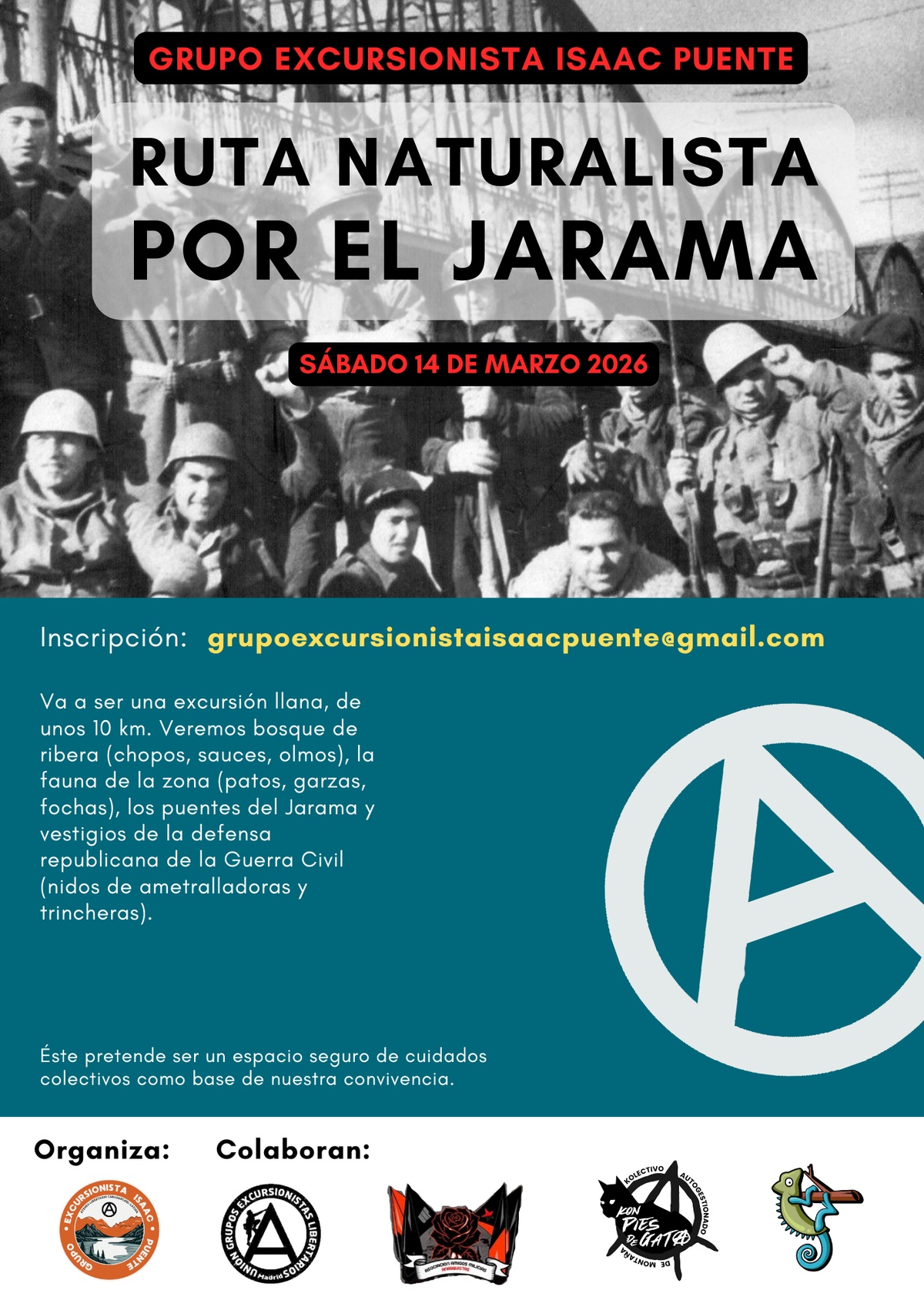 Va a ser una exursión llana, de unos 10 km. Veremos bosque de ribera (chopos, sauces, olmos), la fauna de la zona (patos, garzas, fochas), los puentes del Jarama y vestigios de la defensa republicana de la Guerra Civil (nidos de ametralladoras y trincheras).