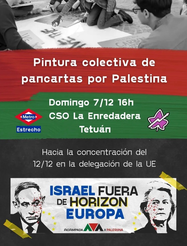 3️⃣ Viernes 12 (18h): Concentración en la Delegación de la Unión Europea en Madrid junto a 20+ otros países. ¡Fin al financiamiento del estado genocida! ¡Israel fuera de Horizon!