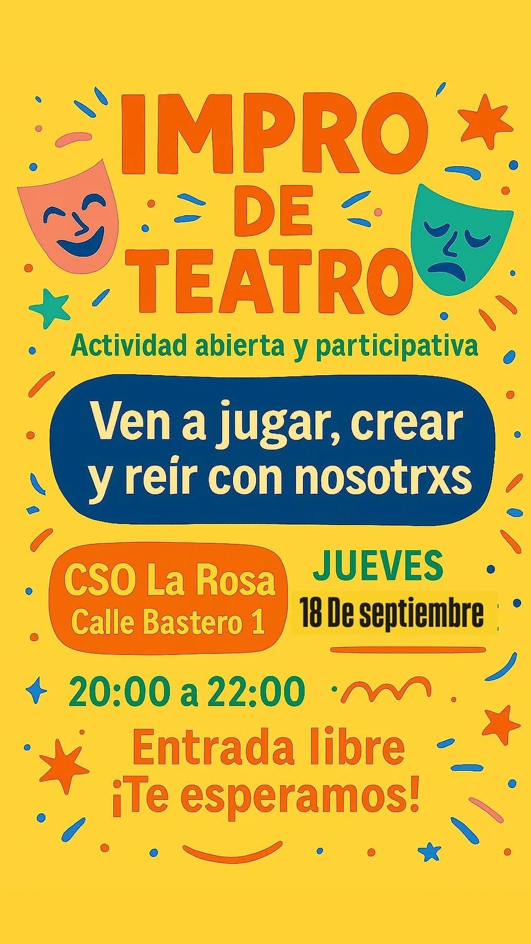 Volvemos a la carga este jueves 4 de septiembre. Desde el grupo de impro de teatro os invitamos a pasar un rato divertido con nosotrxs.