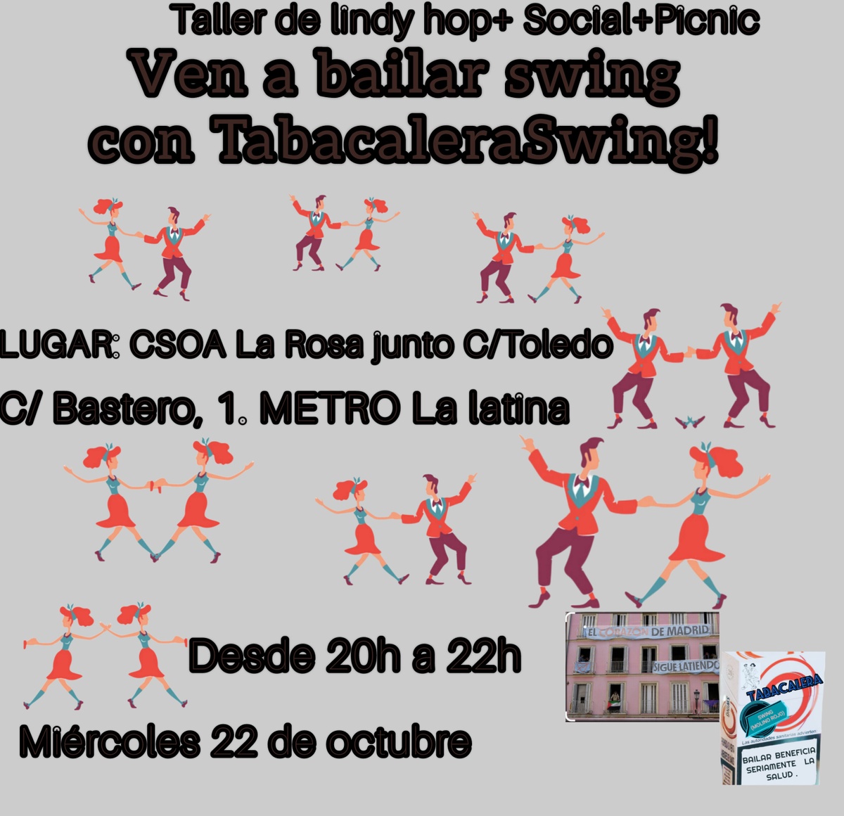 Ven a bailar swing con TabacaleraSwing!! Taller de lindy hop + social para practicar lo aprendido. Finalizamos la actividad con un picnic en el cual llevamos algo para compartir con el grupo sin alcohol 🙏
