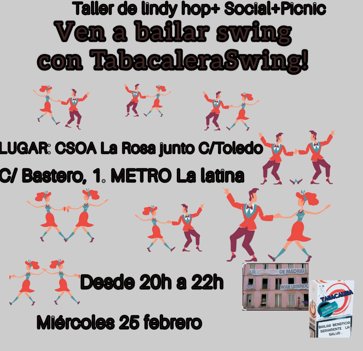 Ven a bailar swing con TabacaleraSwing!! Taller de lindy hop + social para practicar lo aprendido. Finalizamos la actividad con un picnic en el cual llevamos algo para compartir con el grupo sin alcohol 🙏