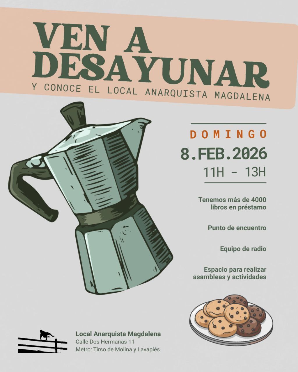 Si todavía no has pasado por el local, es una buena oportunidad para conocerlo (tenemos una biblioteca, espacio para asambleas, radio, propaganda…) y si sueles venir a por libros, vente a pasar un rato con nosotrxs desayunando café y bizcochos.